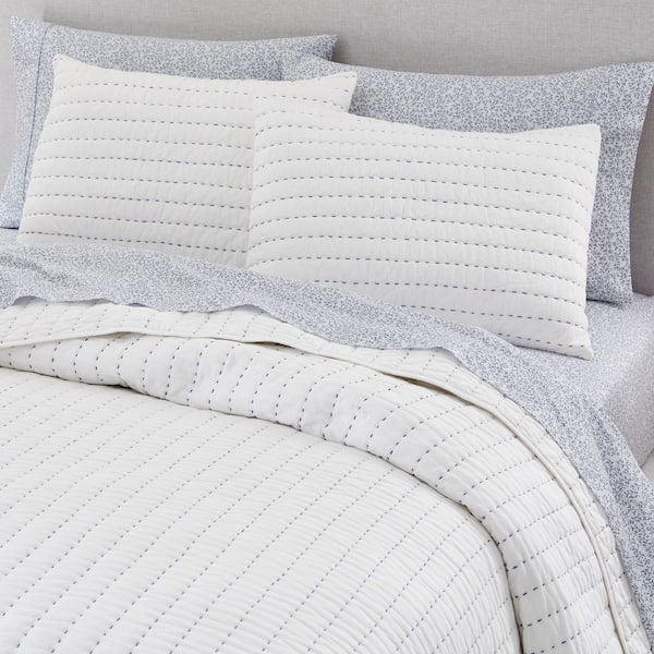 - Hand-quilted, white pick-stitch quilt set with blue detailing