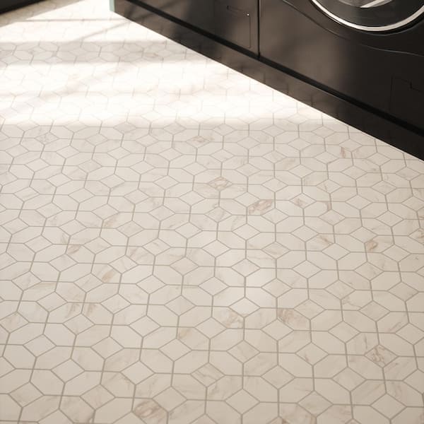 - Floral inspired basketweave mosaic in creamy white with veining
