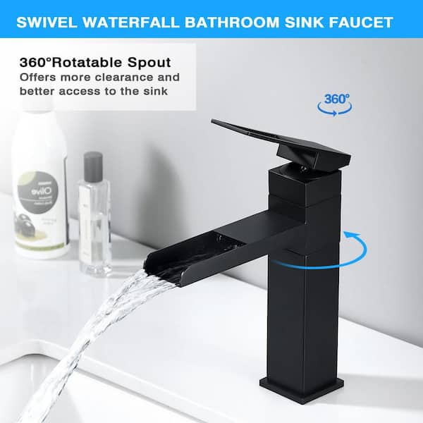 Single Handle Waterfall Wall Mount Bathroom Sink Faucet Drain Kit Included with Swivel Spout in Matte Black