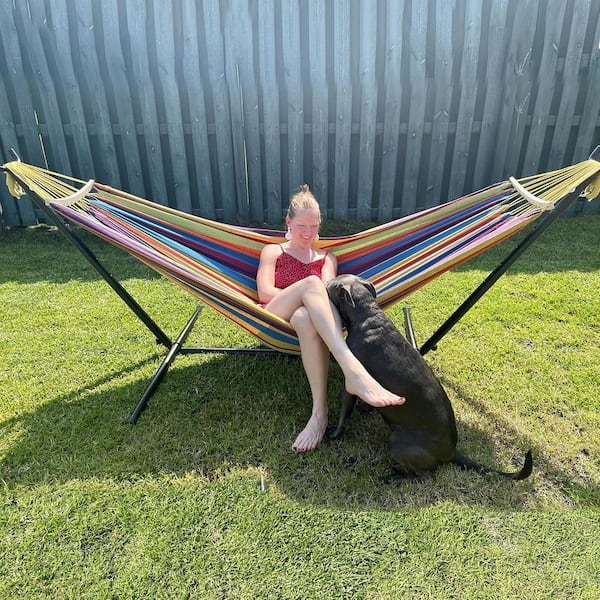 Double Hammock with Stand Included 450 lb. Capacity Steel Stand, Premium Carry Bag Included and 2-Anti Roll Balance Beam