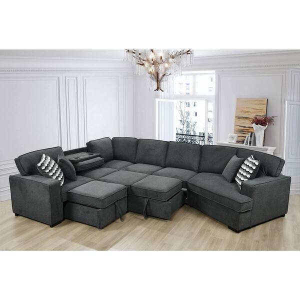 146.5 in. U Shaped Polyester Sectional Sofa in Dark Gray with Storage Chaise, Pull-out Bed, Cup Holders