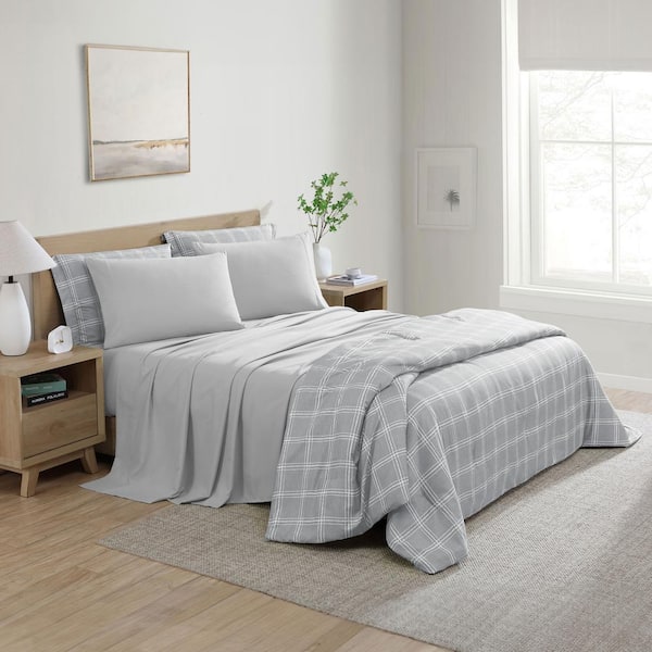 All-Season 5-Piece Reversible Grey Plaid and Solid Color Polyester Microfiber Twin Bed in a Set
