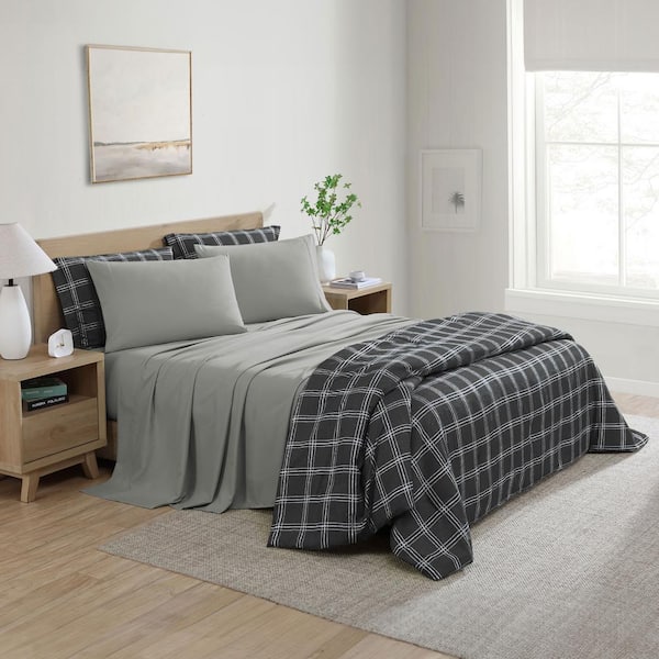 All-Season 7-Piece Reversible Black Plaid and Solid Color Microfiber Full Bed-In-A-Bag Set