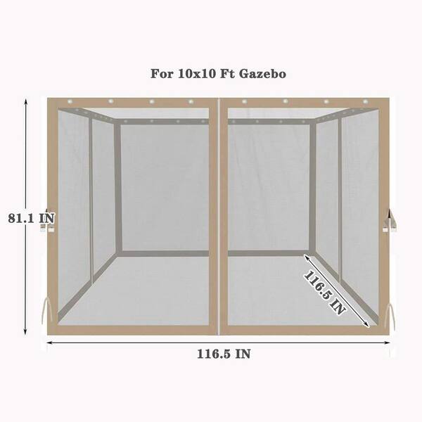 10 ft. x 10 ft. Mosquito Netting for Gazebo Replacement, 4-Side Mesh Walls with Zippers, Beige.