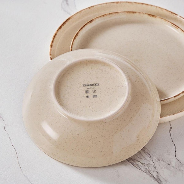 24-Piece Beige Stoneware Dinnerware Set Service for 6 Rustic Design Bowls and Plates Set Sesame Dots Pattern Tableware