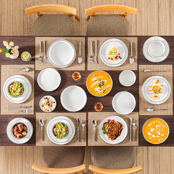 24-Piece White Color Black Rim Porcelain Dinnerware Set Service for 6 Tableware Bowls and Plates Dinner Set