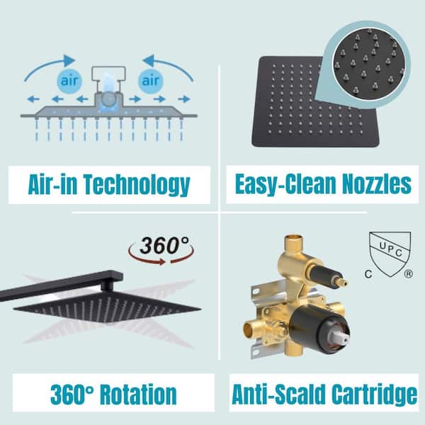 12 in. 1-Jet Shower System with Fixed and Hand Shower Head Tub Faucet in Matte Black