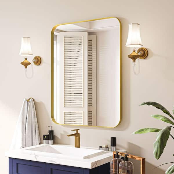 28 in. W x 36 in. H Rectangular Aluminum Framed Wall Bathroom Vanity Mirror in Gold