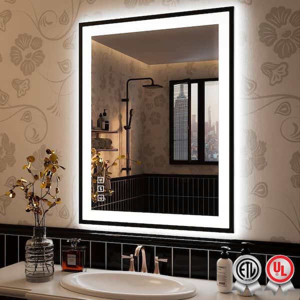 32 in. W x 24 in. H Rectangular Framed Anti-Fog LED Wall Bathroom Vanity Mirror in Black with Backlit and Front Light