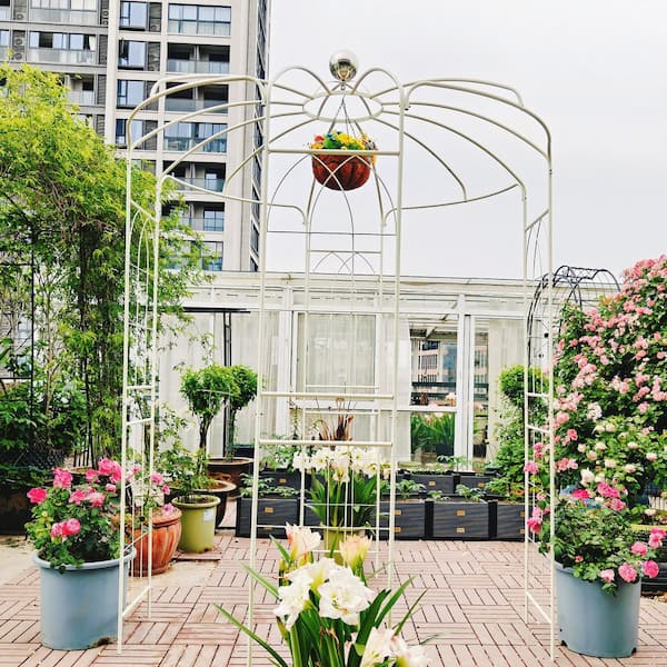 114.2 in. x 81.3 in. Metal Iron Garden Arch Birdcage Shape Pergola Pavilion Arbor for Outdoor Activity in White