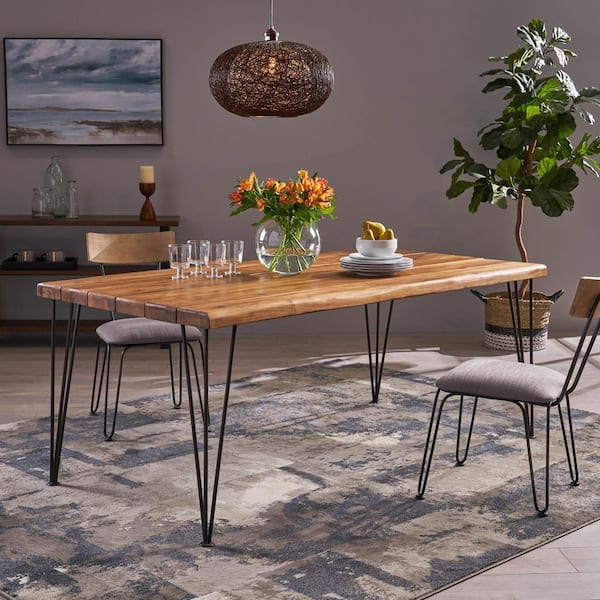 • Rich acacia wood tabletop and durable powder-coated metal legs