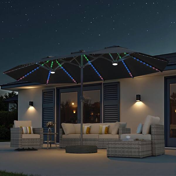 Alpine B 15 ft. Solar Colour LED Light Outdoor Double-Sided Market Patio Umbrella, UV Protection with Base in Dark Gray