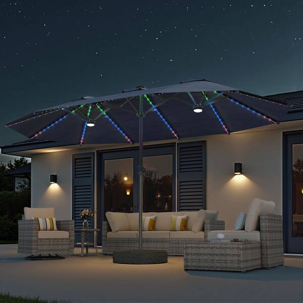 Alpine B 15 ft. Solar Colour LED Light Outdoor Double-Sided Market Patio Umbrella, UV Protection with Base in Navy Blue