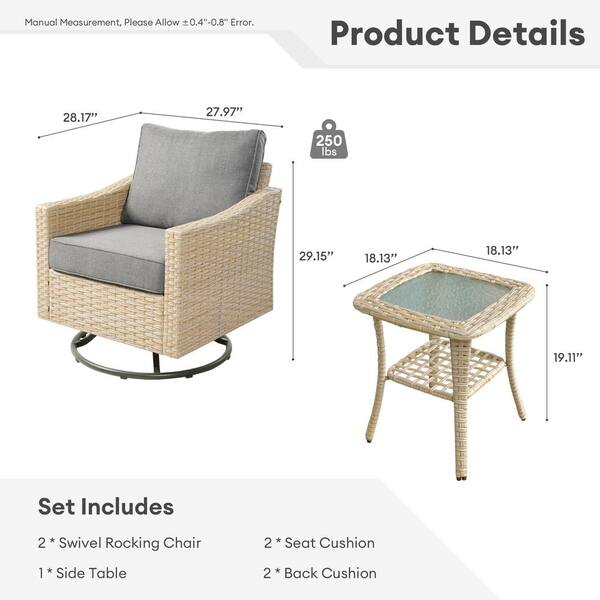 Camelia Beige 3-Piece Wicker Patio Swivel Rocking Chairs Seating Set with Cafe Table and Dark Gray CushionGuard Cushions