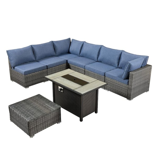 Daffodil A Gray 8-Piece Wicker Patio Rectangular Fire Pit Conversation Sofa Set with Denim Blue Cushions
