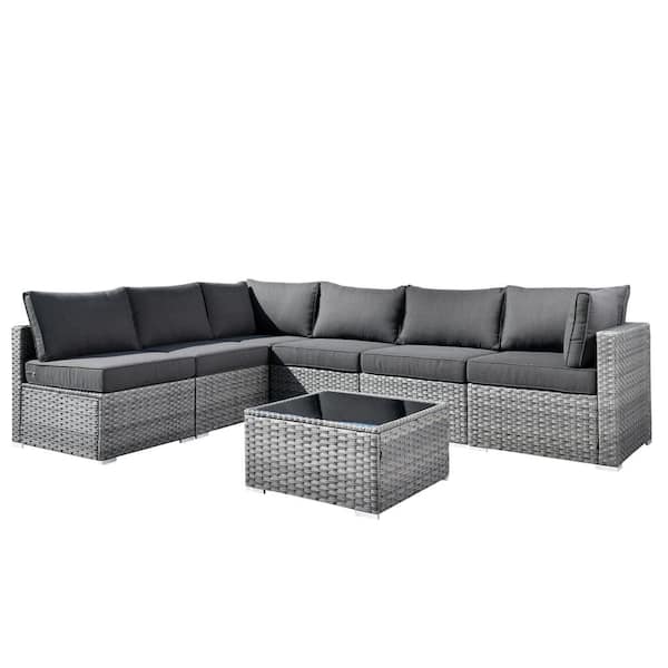 Daffodil D Gray 7-Piece Wicker Patio Conversation Sofa Set with Black Cushions
