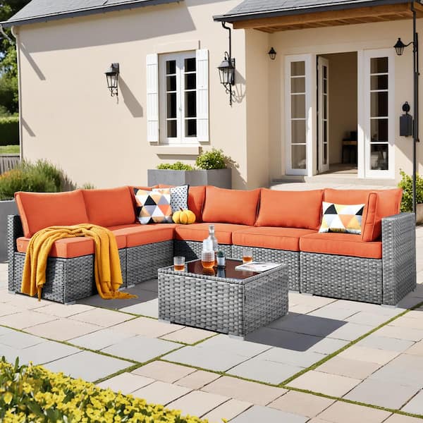 Daffodil D Gray 7-Piece Wicker Patio Conversation Sofa Set with Orange Red Cushions