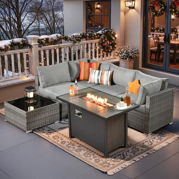 Daffodil J Gray 6-Piece Wicker Patio Outdoor Conversation Sofa Set with Gas Fire Pit and Dark Gray Cushions