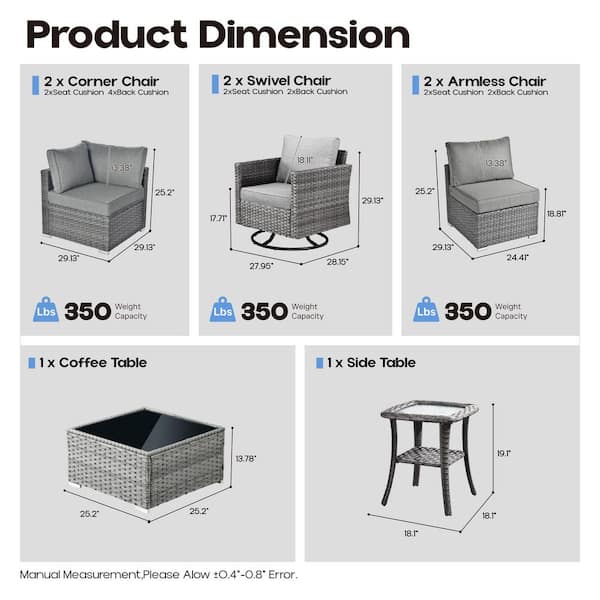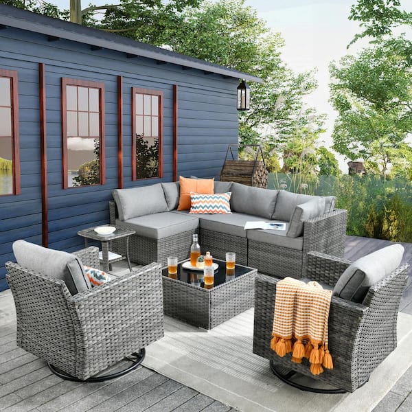 Daffodil K Gray 8-Piece Wicker Patio Outdoor Conversation Sofa Set with Swivel Rocking Chairs and Dark Gray Cushions
