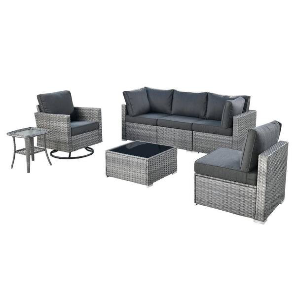 Daffodil M Gray 7-Piece Wicker Patio Outdoor Conversation Sofa Set with a Swivel Rocking Chairs and Black Cushions