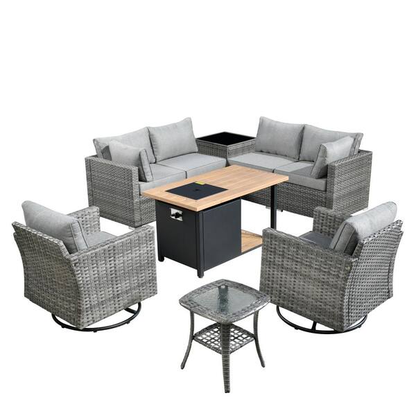 Daffodil P Gray 9-Piece Wicker Patio Storage Fire Pit Conversation Set with Swivel Rocking Chairs and Dark Gray Cushions