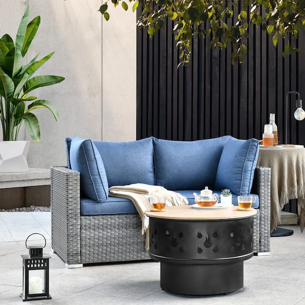 Daffodil Q Gray 3-Piece Wicker Patio Wood Burning Fire Pit Conversation Sofa Set with Denim Blue Cushions
