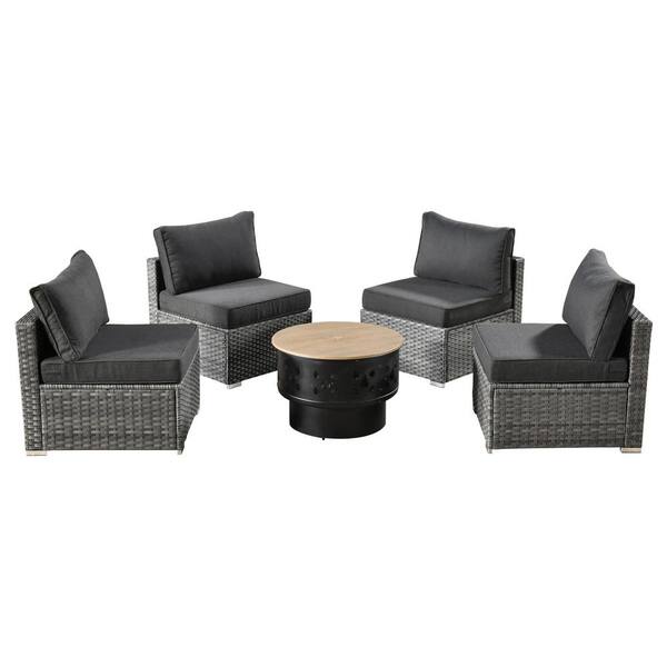 Daffodil S Gray 5-Piece Wicker Patio Wood Burning Fire Pit Conversation Sofa Set with Black Cushions
