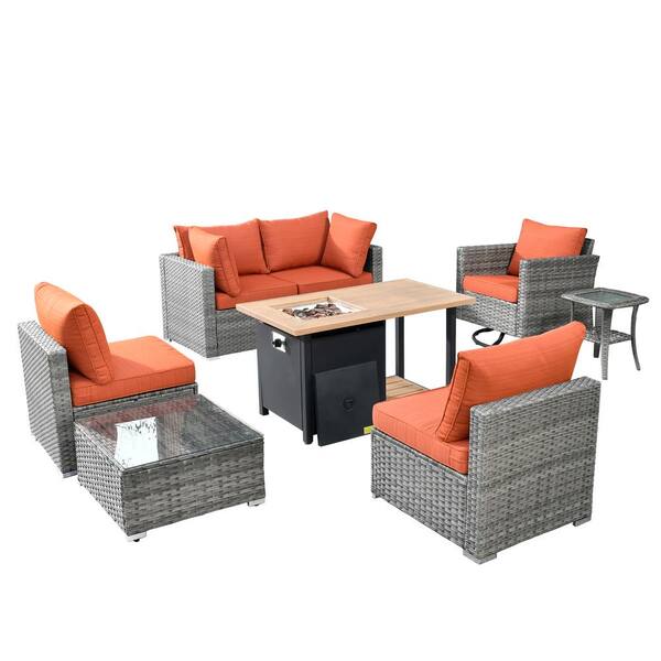 Daffodil Y Gray 8-Piece Wicker Patio Storage Fire Pit Conversation Set with Swivel Rocking Chair and Orange Red Cushions