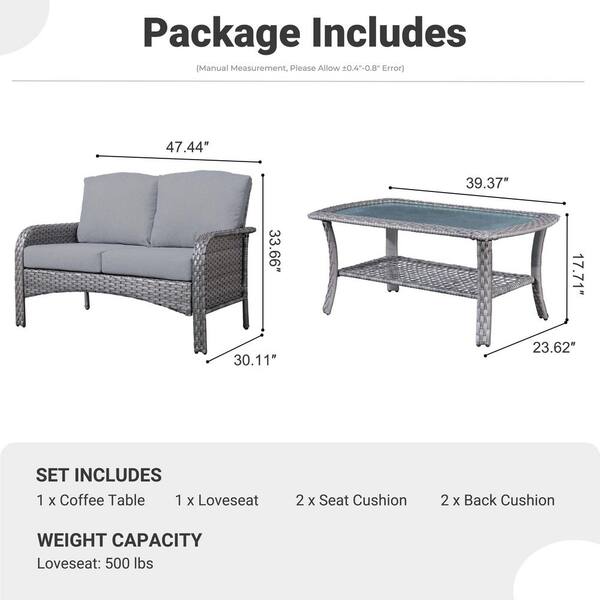 Hyacinth Gray 2-Piece Wicker Patio Outdoor Conversation Loveseat Set with a Coffee Table and Dark Gray Cushions