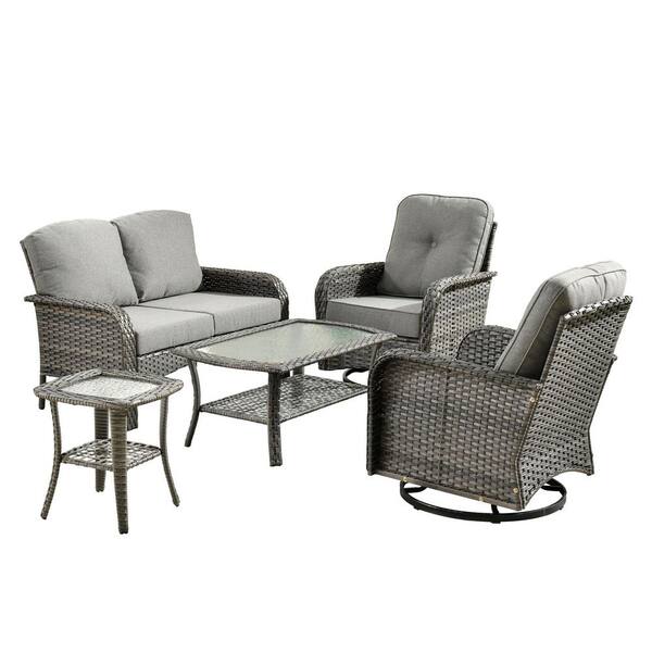 Lily A Gray 5-Piece Wicker Patio Conversation Seating Set with Swivel Rocking Chairs Coffee Table and Dark Gray Cushion
