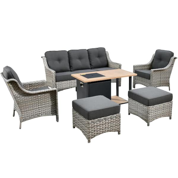 Tulip A Gray 6-Piece Wicker Patio Storage Fire Pit Conversation Sofa Set with Black Cushions
