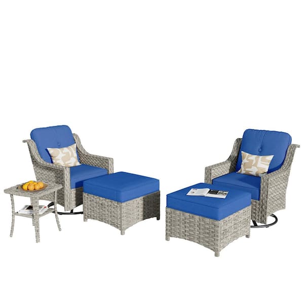 Tulip E 5-Piece Wicker Swivel Outdoor Rocking Chairs Patio Conversation Set with Navy Blue Cushions