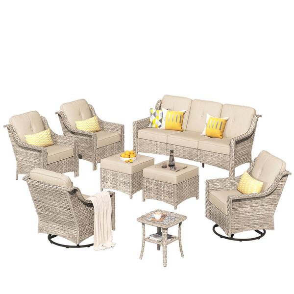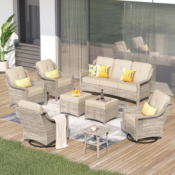 Tulip K Gray 8-Piece Wicker Patio Outdoor Conversation Sofa Set with Swivel Rocking Chairs and Beige Cushions