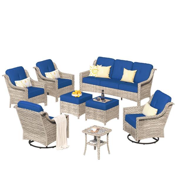 Tulip K Gray 8-Piece Wicker Patio Outdoor Conversation Sofa Set with Swivel Rocking Chairs and Navy Blue Cushions