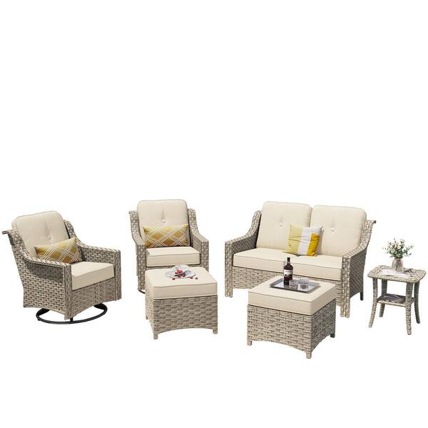 Tulip L Gray 6-Piece Wicker Patio Outdoor Conversation Sofa Set with Swivel Rocking Chairs and Beige Cushions