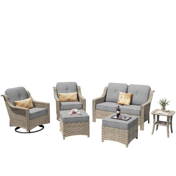 Tulip L Gray 6-Piece Wicker Patio Outdoor Conversation Sofa Set with Swivel Rocking Chairs and Dark Gray Cushions