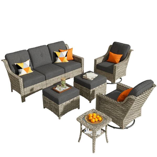Tulip Y Gray 6-Piece Wicker Patio Outdoor Conversation Sofa Set with Swivel Rocking Chairs and Black Cushions