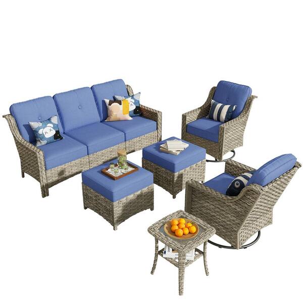 Tulip Y Gray 6-Piece Wicker Patio Outdoor Conversation Sofa Set with Swivel Rocking Chairs and Diamond Blue Cushions