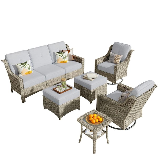 Tulip Y Gray 6-Piece Wicker Patio Outdoor Conversation Sofa Set with Swivel Rocking Chairs and Light Gray Cushions