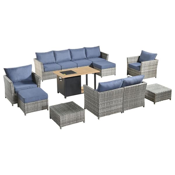 XIWD Gray 13-Piece Wicker Outerdoor Patio Storage Fire Pit Sectional Seating Set with Denium Blue Cushions