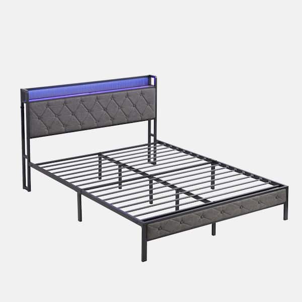 Dark Gray Metal Frame Full Platform Bed with Storage Headboard, Charging Station, and LED Lights