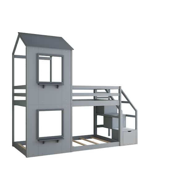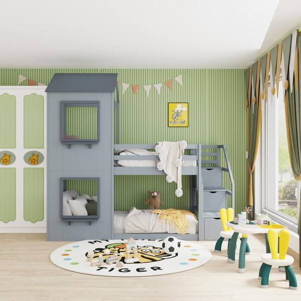 Gray Twin Bunk Bed Wood with Storage