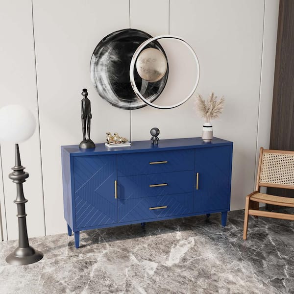Navy Blue 32.68 in. 2-Door 3-Drawer Cabinet with Carved Effect