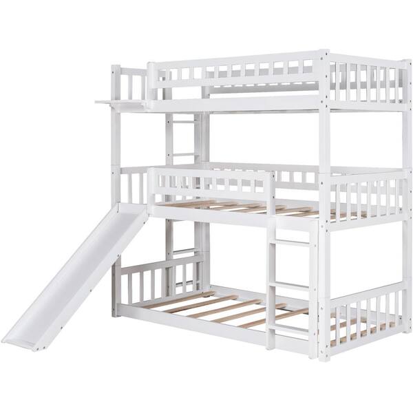 White Twin Triple Bed with Built-in Ladder and Slide, Triple Bunk Bed with Guardrails